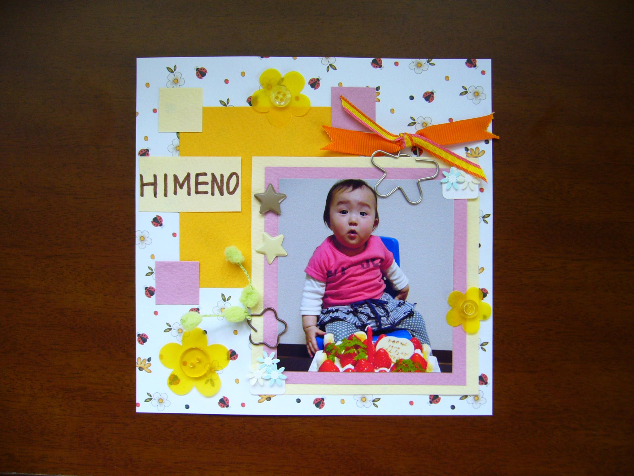 昨日 友達のかなり遅れた出産祝いに、洋服と6インチ(約15センチ×15センチ)の後は、写真を飾るだけ♪ っていう作品をプレゼントしてみました(●^o^●)♪♪